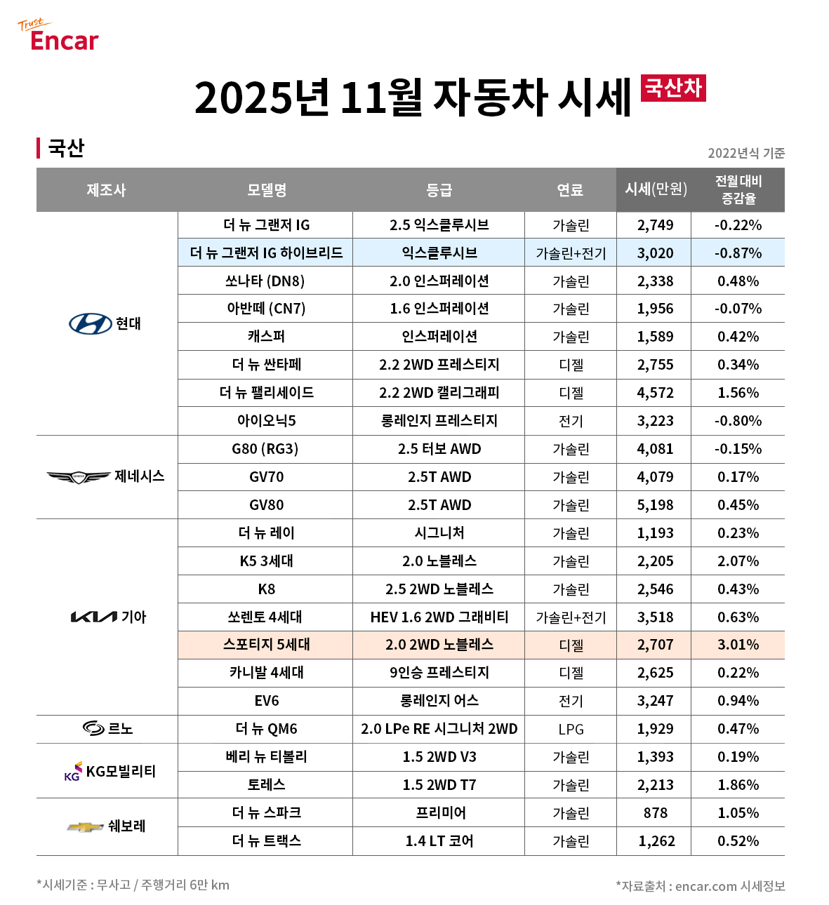 엔카닷컴이 2025년 11월 중고차 시세를 공개했다. 이번에 공개된 중고차 시세는 엔카닷컴 빅데이터를 토대로 현대자동차, 기아, 르노코리아자동차, KG모빌리티 등 국내 완성차 브랜드와 벤츠, BMW, 아우디 등 수입차 브랜드의 2022년식 인기 차종 중고차 시세를 분석한 결과다. 주행거리 기준은 60,000km이며 무사고 차량을 대상으로 분석했다.